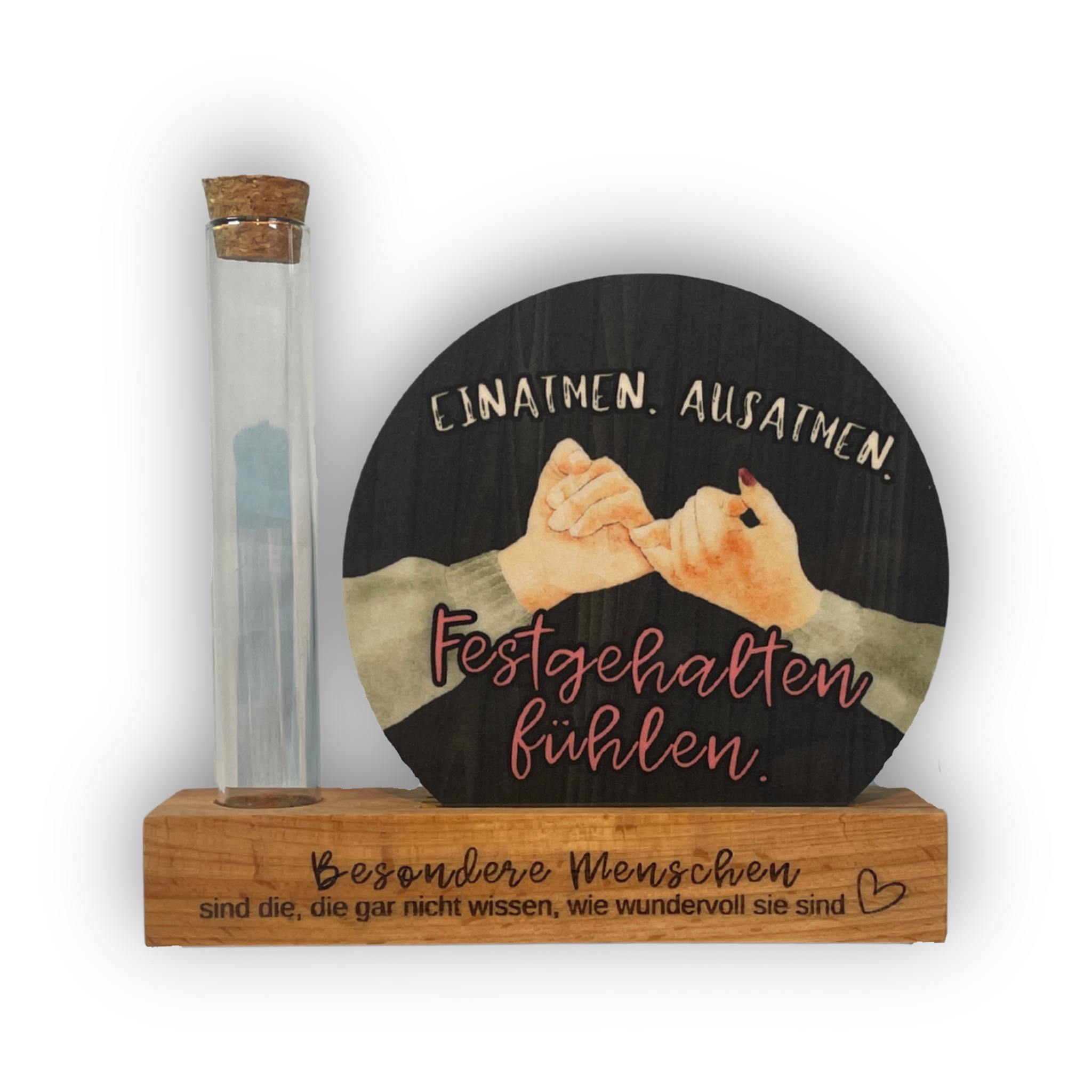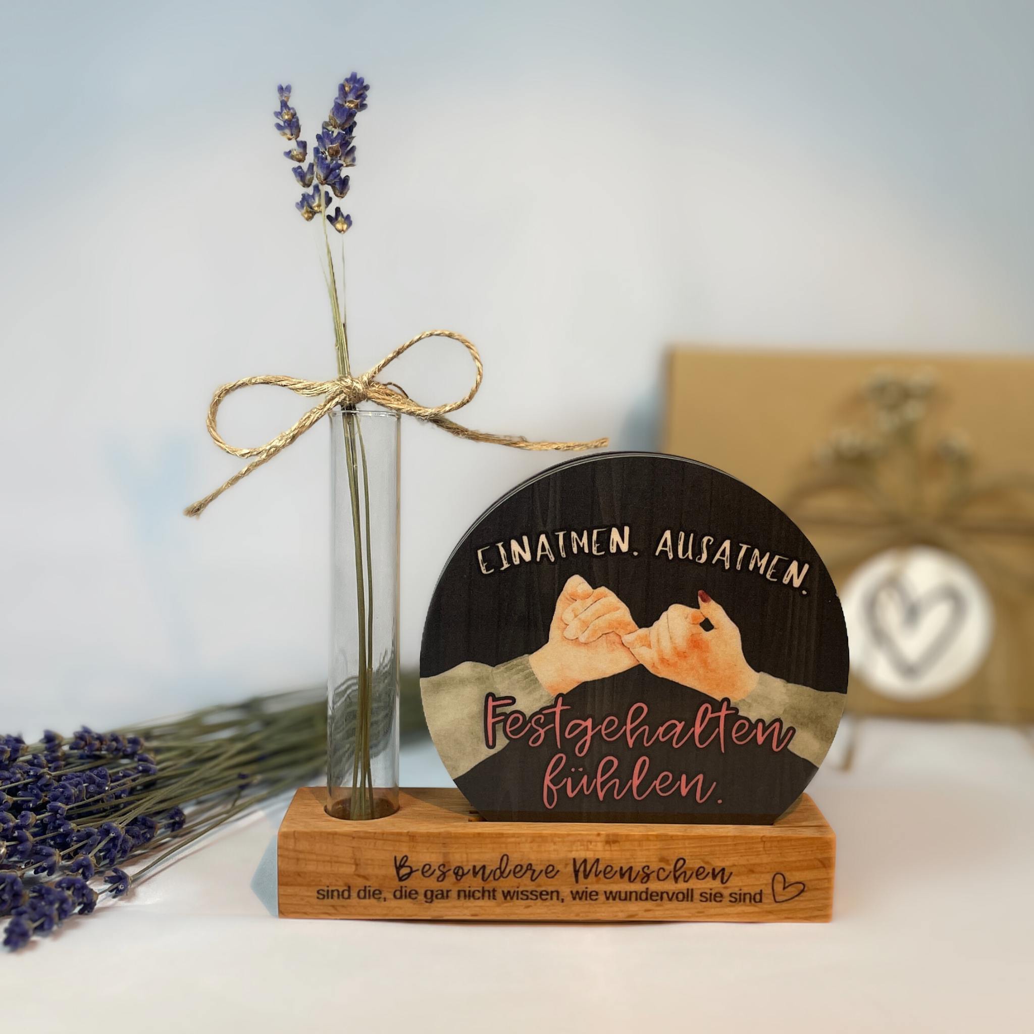 - Integriertes Reagenzglas im Halter, gefüllt mit Trockenblumen oder als kreatives Geldgeschenk nutzbar