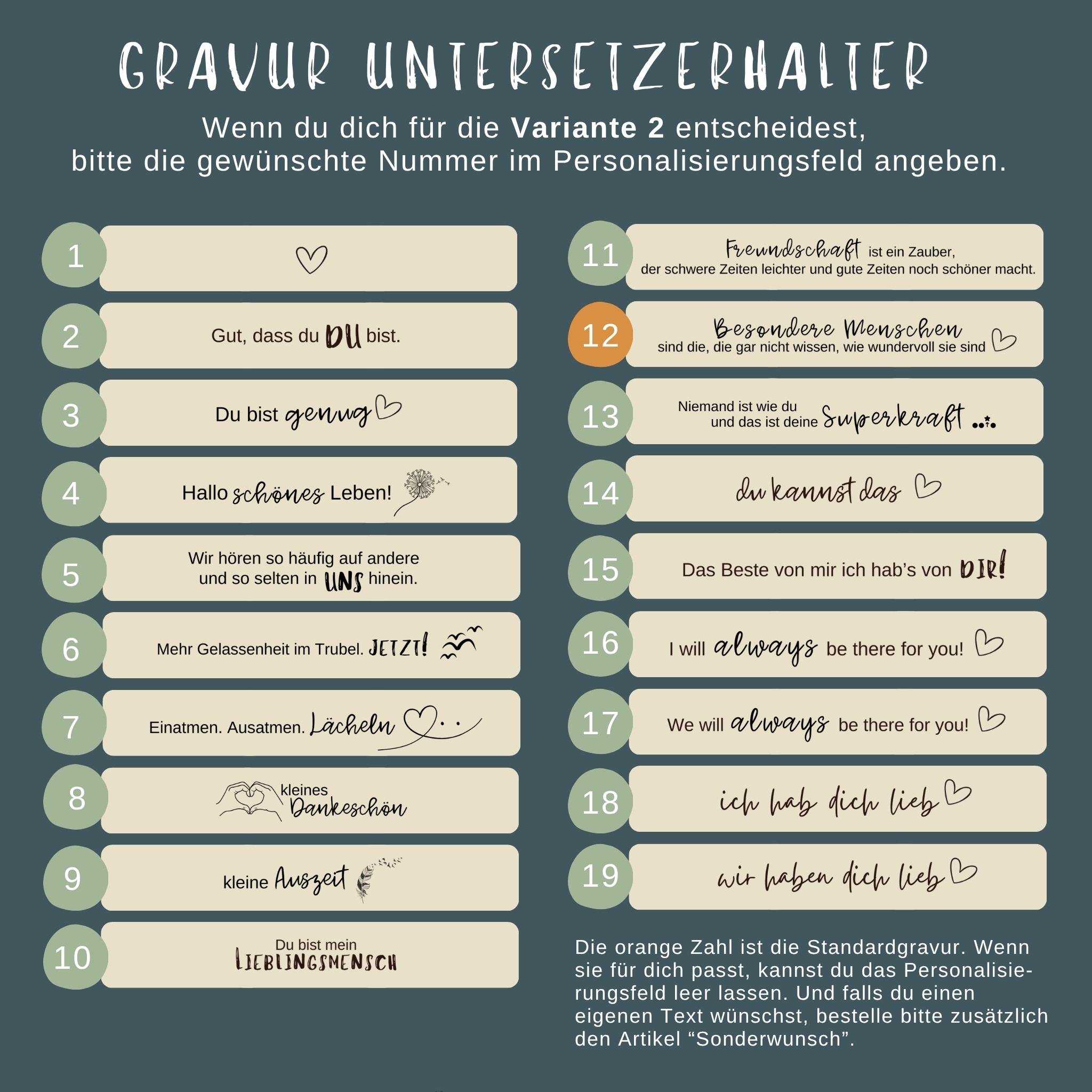 - Hochwertiger Untersetzerhalter aus Buchenholz, geölt mit Leinöl, optional gravierbar auf Anfrage