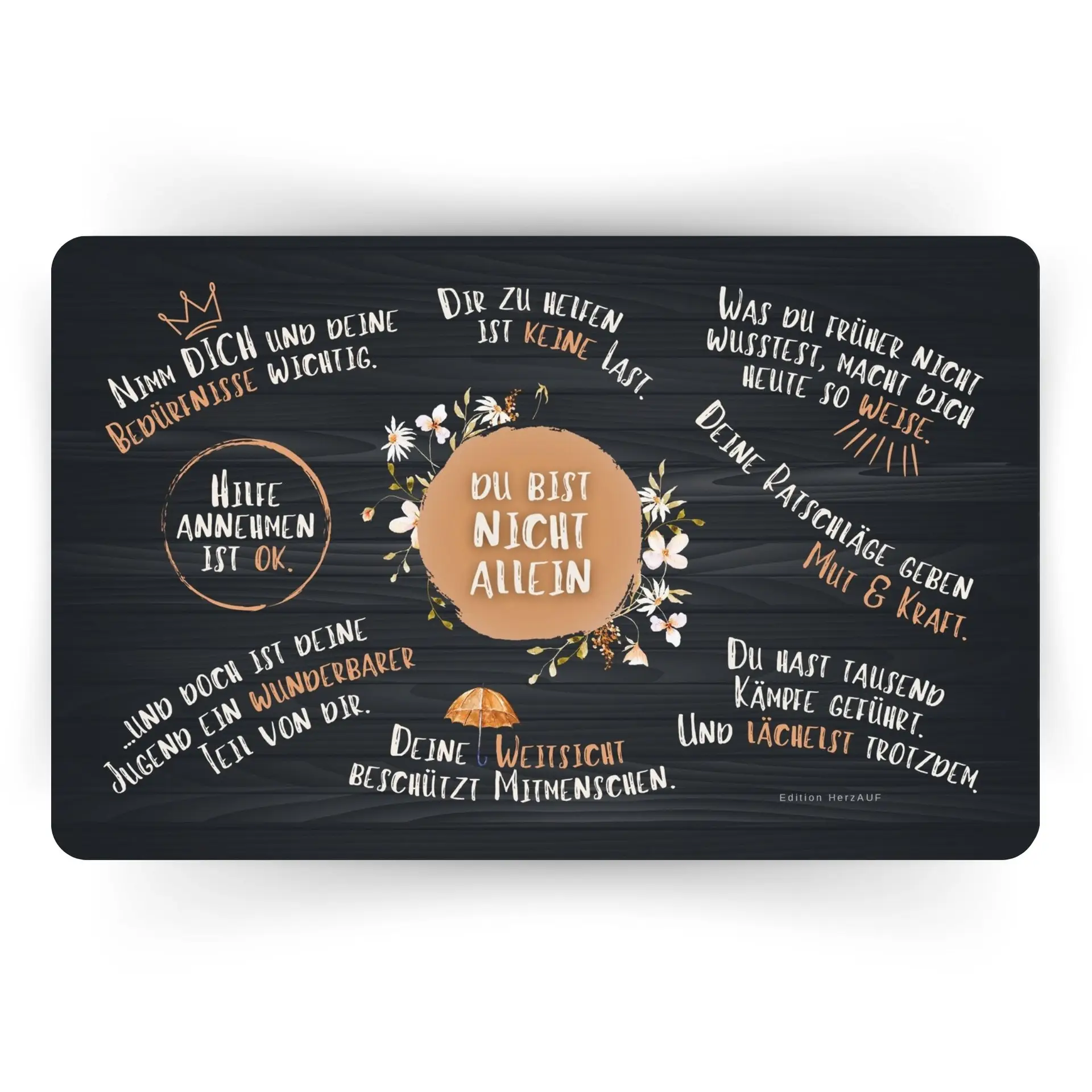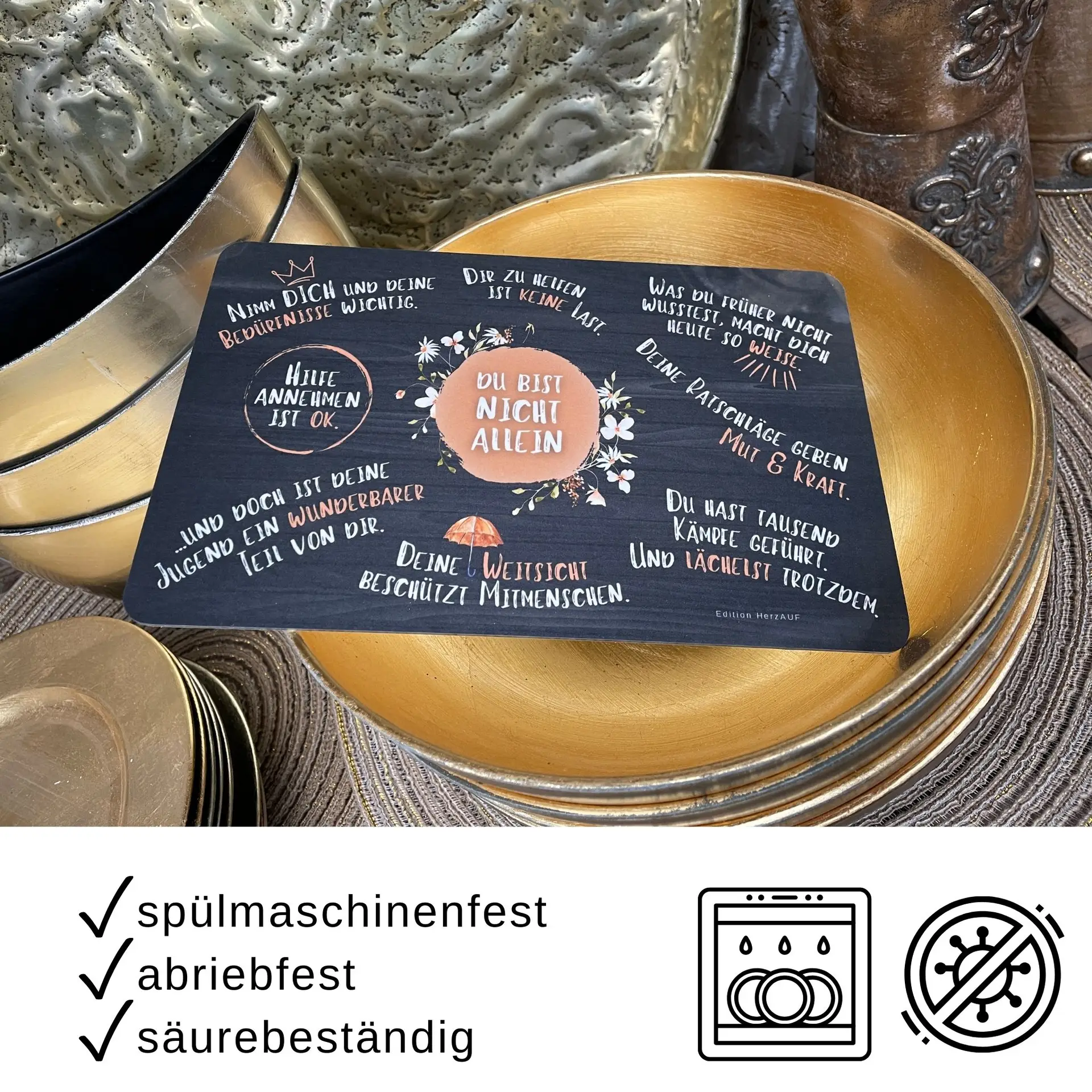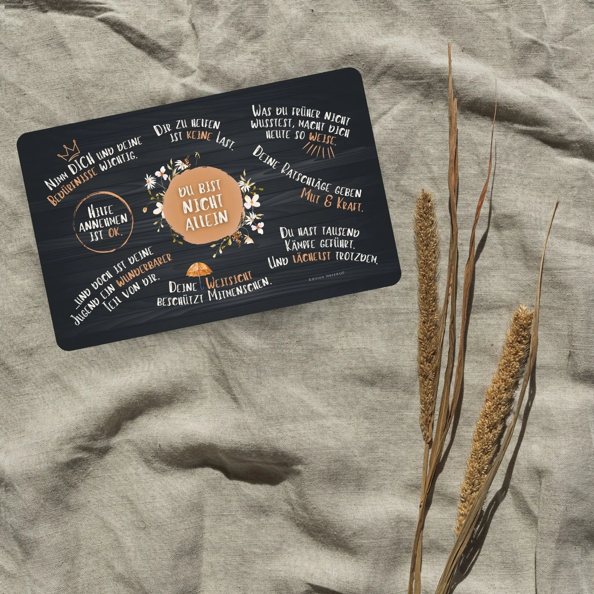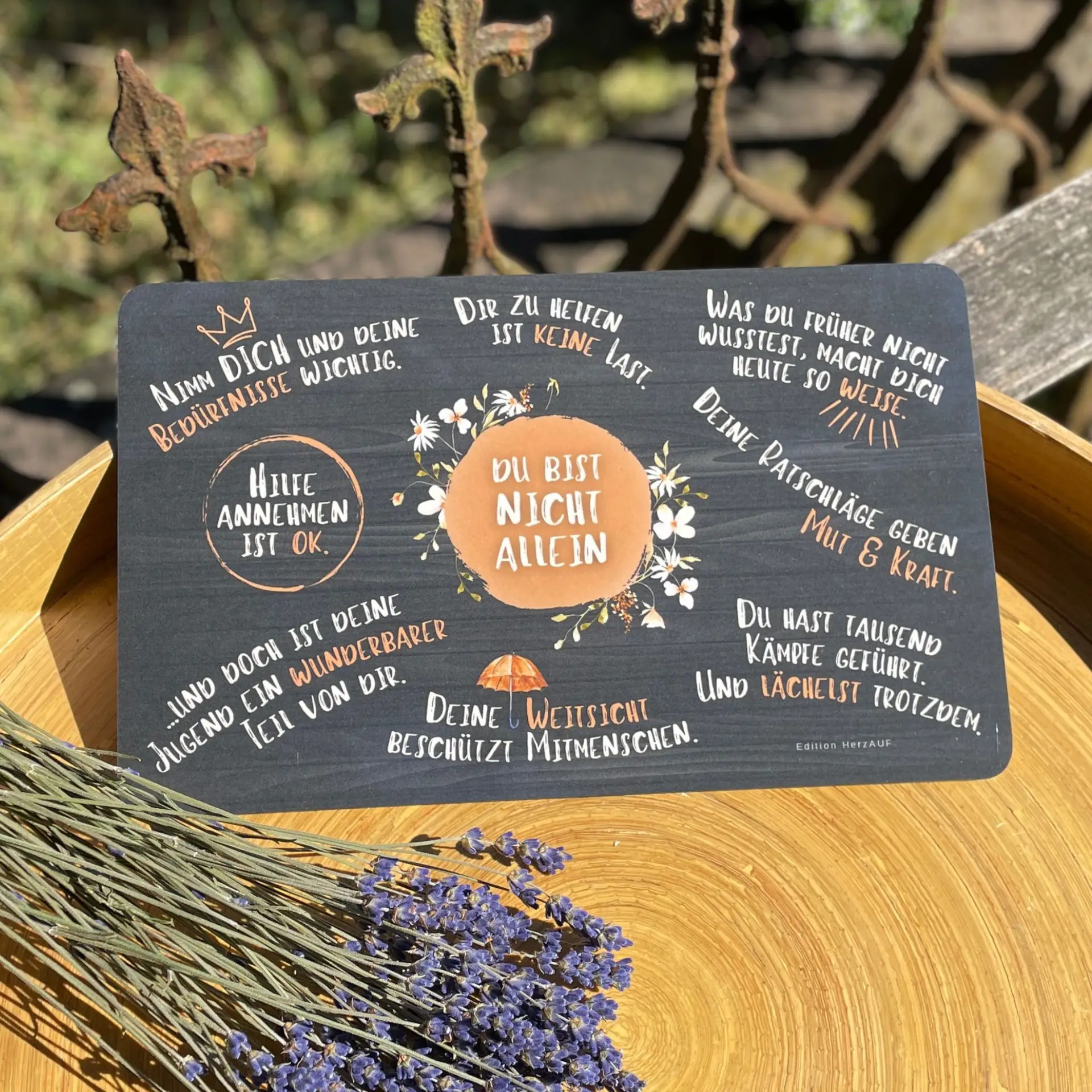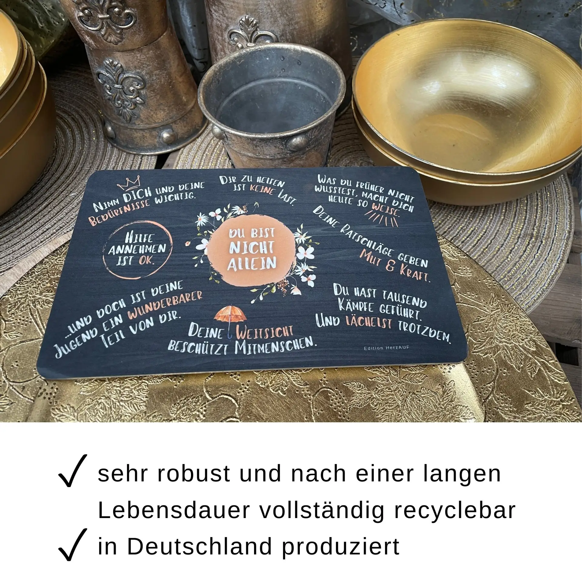 Ein liebevolles Zeichen der Verbundenheit – das Frühstücksbrett „Du bist nicht allein“ bringt Wärme und Trost in den Alltag älterer Menschen. Ob als Geschenk zum 90. Geburtstag, für Senioren im Altenheim oder als Ostergeschenk, dieses Brettchen erinnert liebevoll daran, dass jemand an sie denkt.