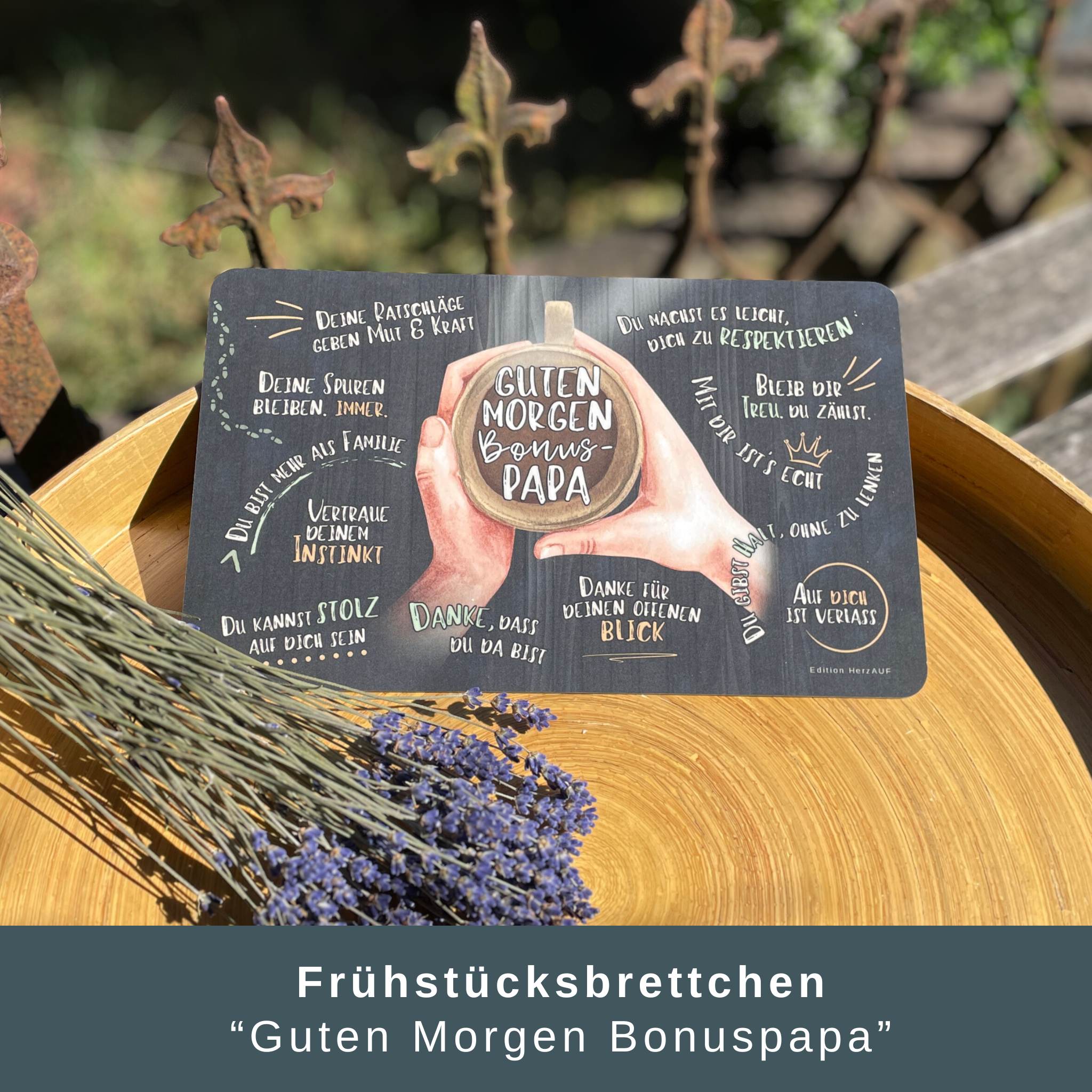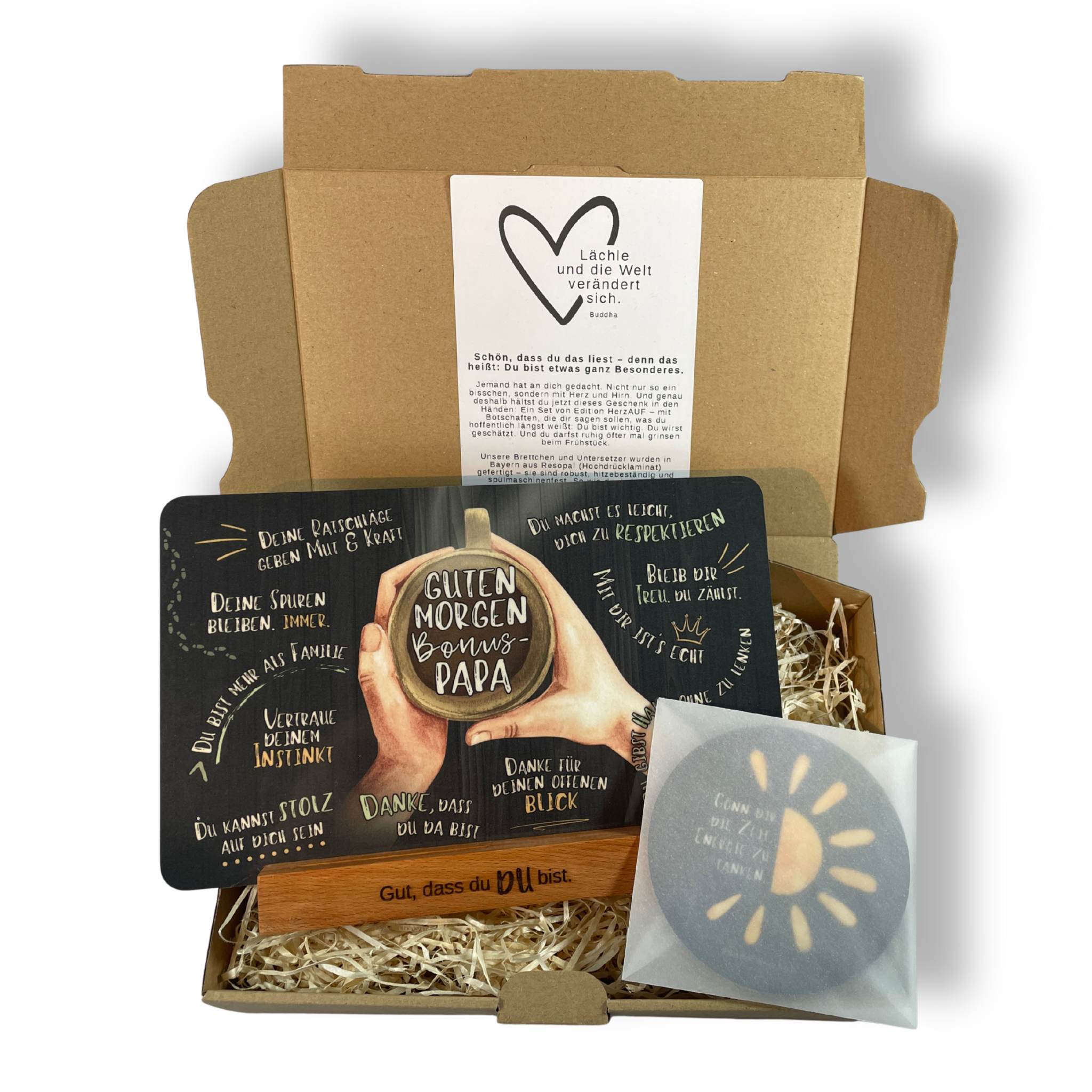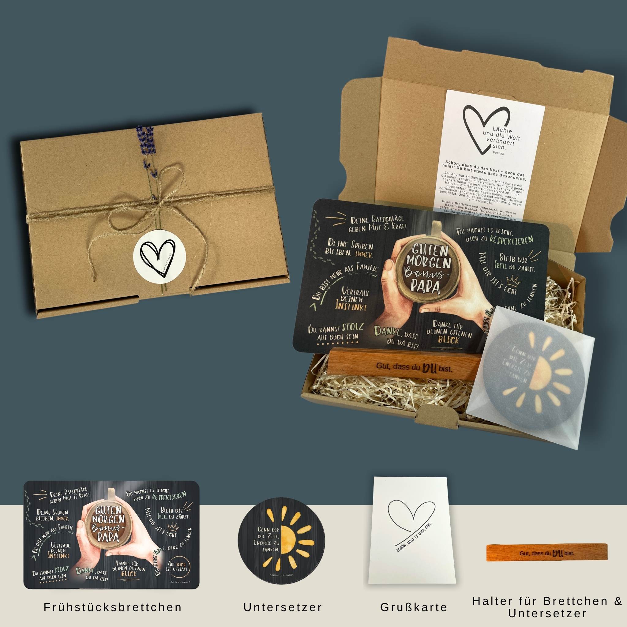Das Set besteht aus einem liebevoll gestalteten Frühstücksbrett mit der Aufschrift „Guten Morgen Bonuspapa“, einem motivierenden Getränkeuntersetzer mit dem Spruch „Gönn dir die Zeit, Energie zu tanken“ sowie einem eleganten Halter aus geöltem Buchenholz.