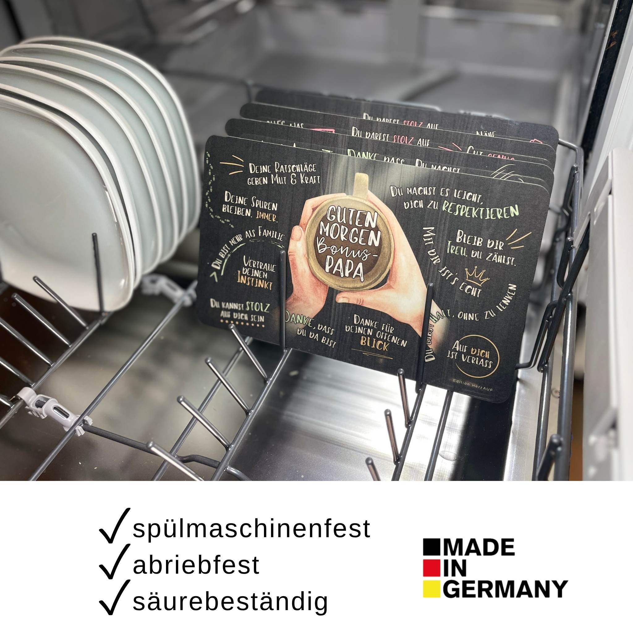 Sowohl Frühstücksbrettchen als auch Getränkeuntersetzer sind spülmaschinengeeignet und dadurch besonders pflegeleicht.