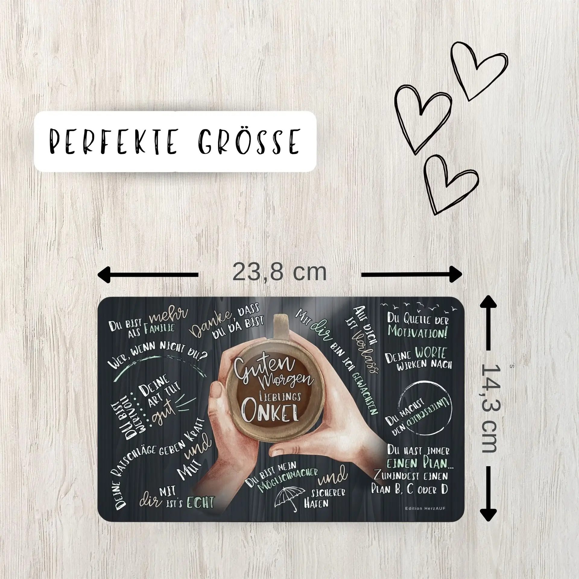 Für den Onkel, der immer einen lockeren Spruch parat hat, dich zum Lachen bringt und für den du einfach nur dankbar bist: Mit dem Frühstücksbrett „Guten Morgen Lieblingsonkel“ verschenkst du ein Stück Wertschätzung – jeden Tag aufs Neue.