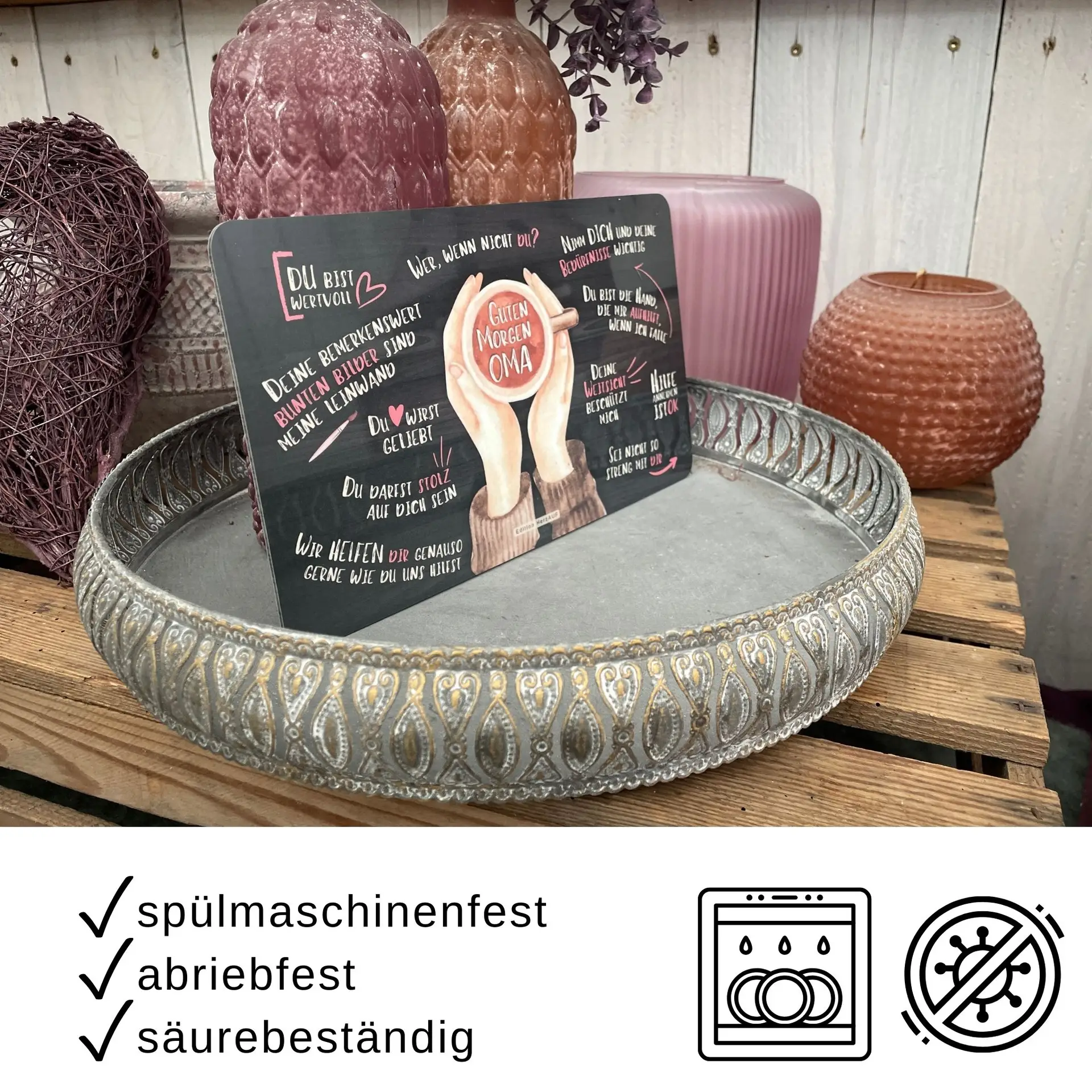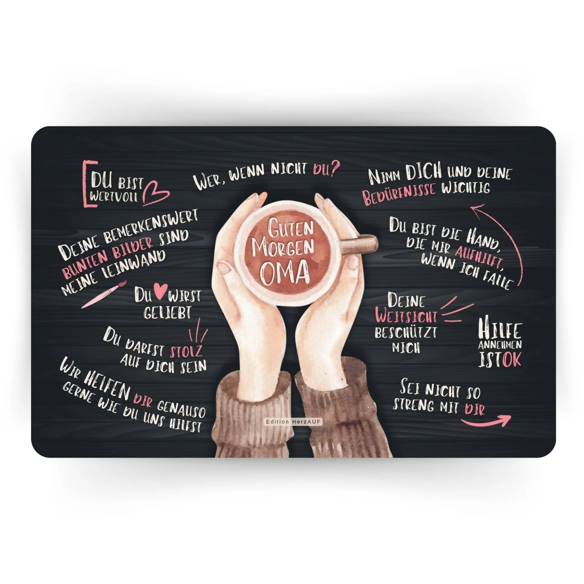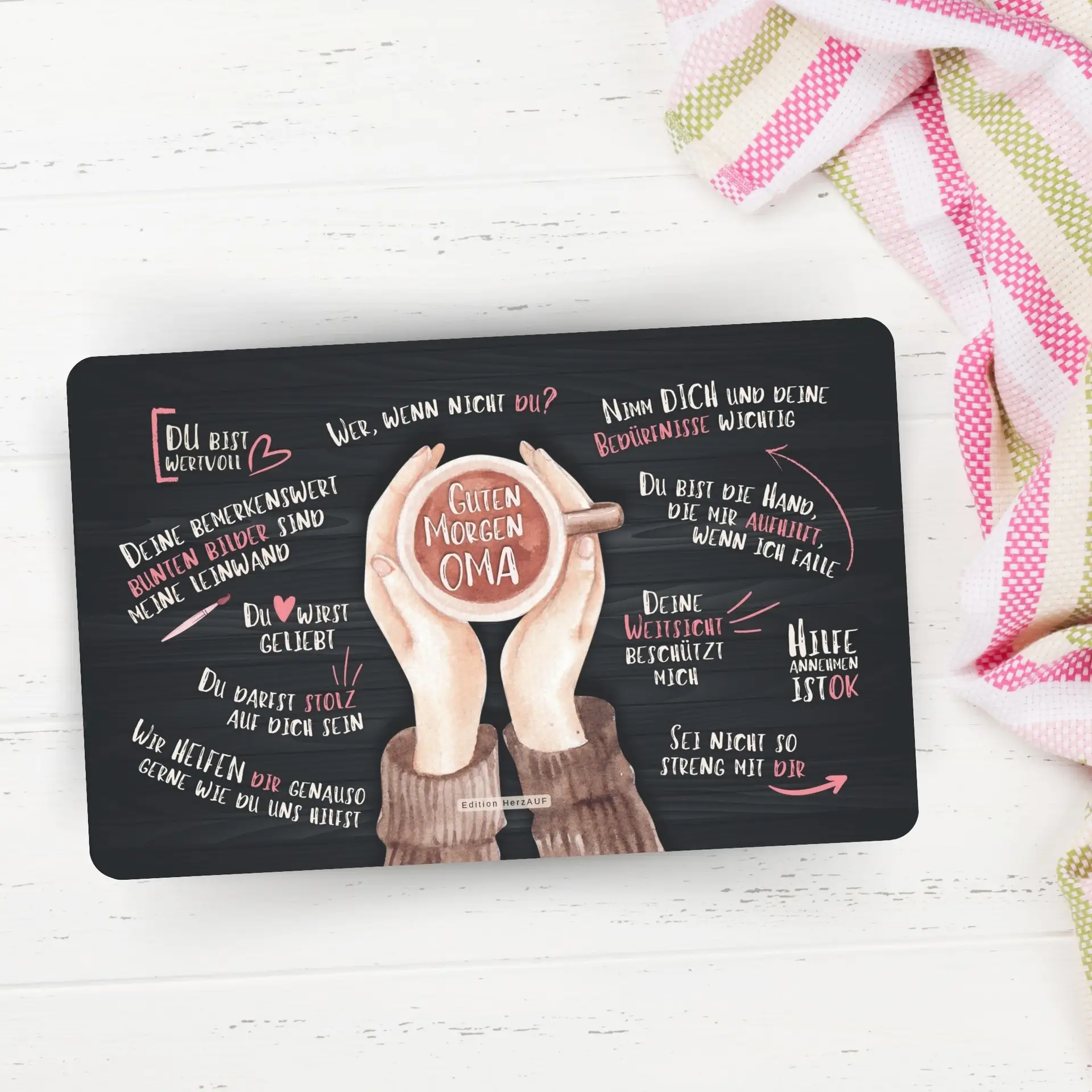 Das Frühstücksbrett „Guten Morgen Oma!“ ist das perfekte Geschenk für alle liebevollen Omas da draußen. Mit seinem persönlichen Design aus einer Kaffeetasse und motivierenden Sprüchen wird es zum Lieblings-Accessoire in jeder Oma-Küche.