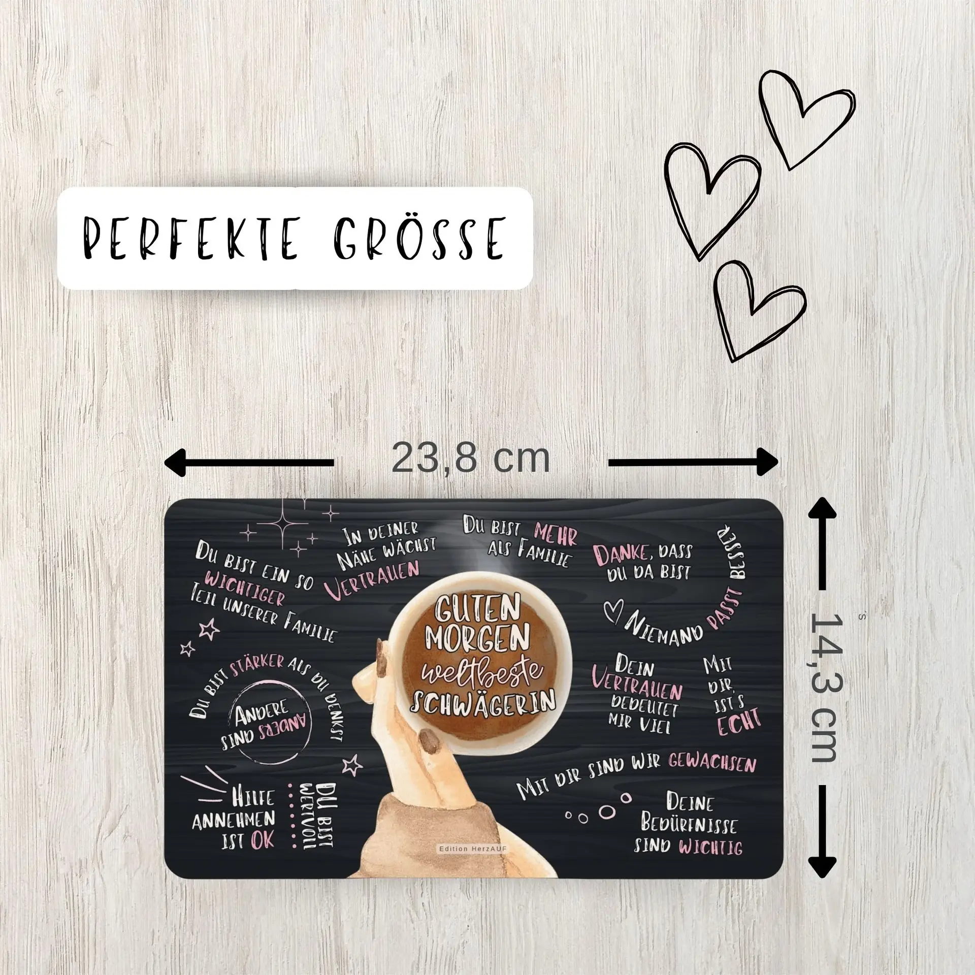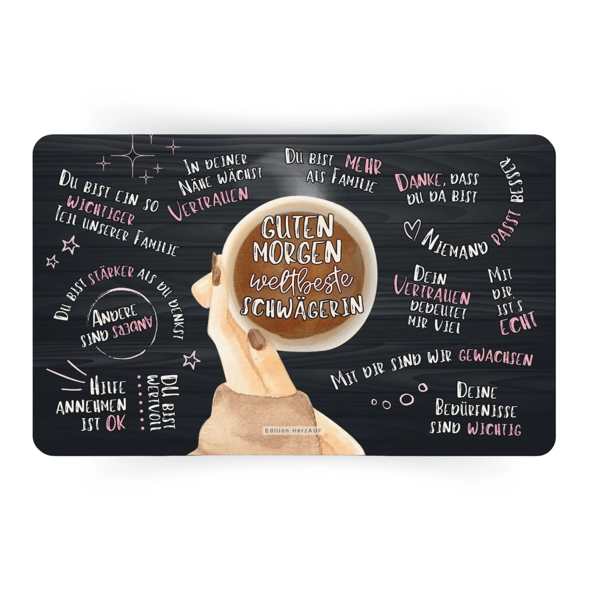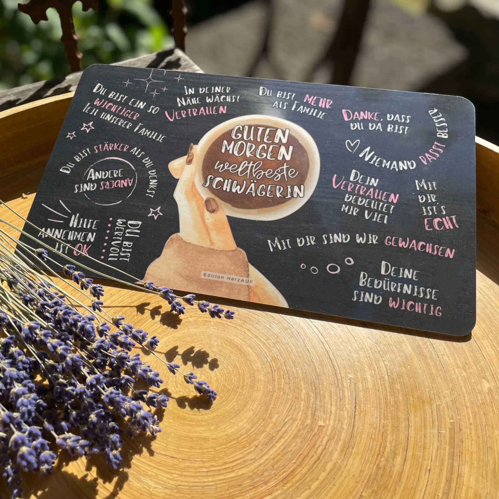 Ob sie zur Familie gehört, seit du denken kannst, oder erst durch die Liebe dazugestoßen ist – deine Schwägerin ist etwas ganz Besonderes. Mit dem Frühstücksbrett „Guten Morgen weltbeste Schwägerin“ verschenkst du ein liebevolles Stück Aufmerksamkeit, das ihr jeden Morgen zeigt, wie sehr du sie schätzt.