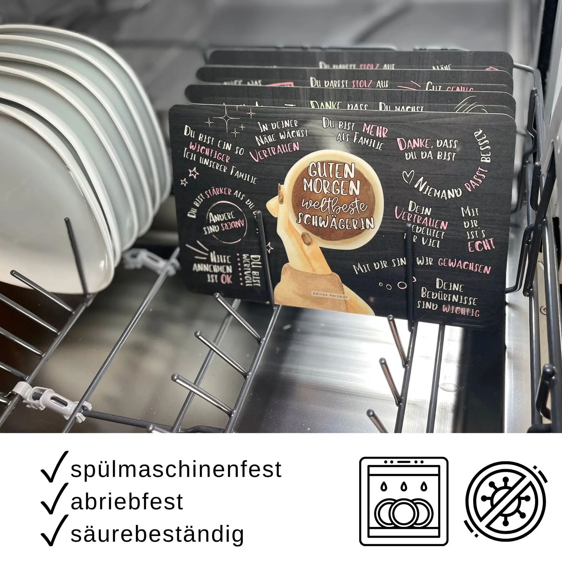 Sowohl Frühstücksbrettchen als auch Getränkeuntersetzer sind spülmaschinengeeignet und dadurch besonders pflegeleicht.