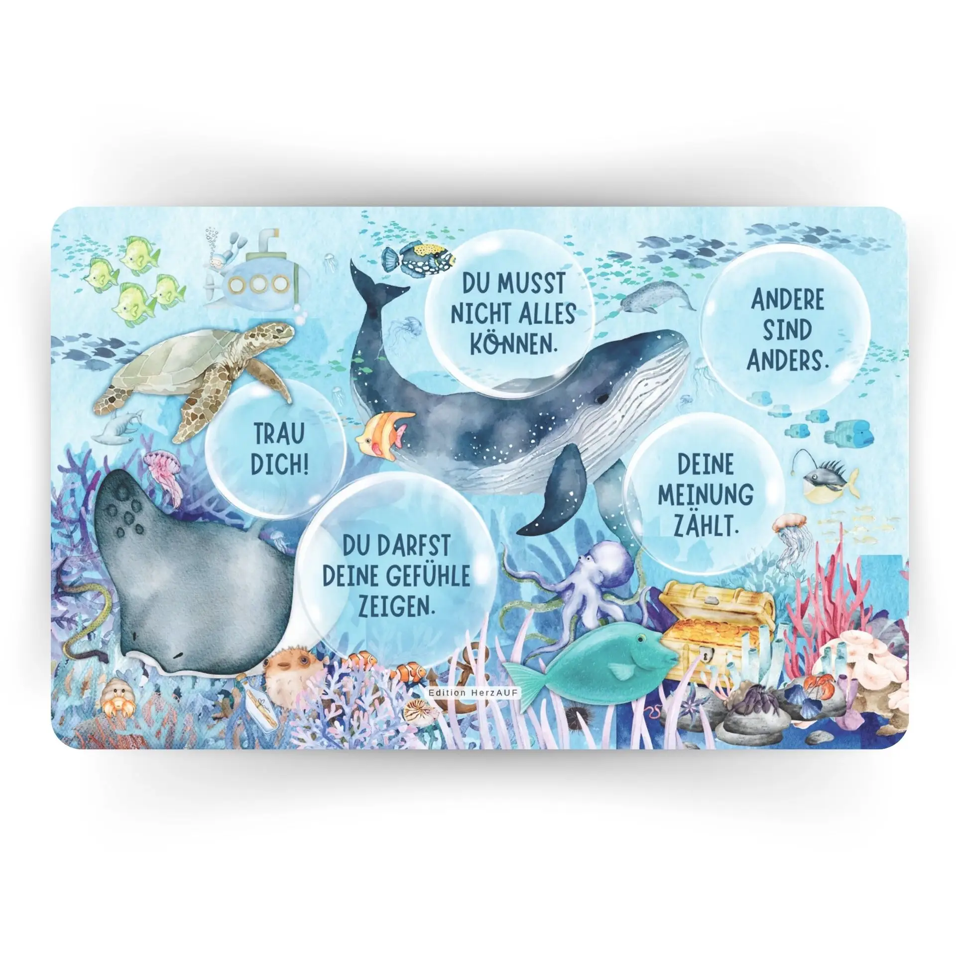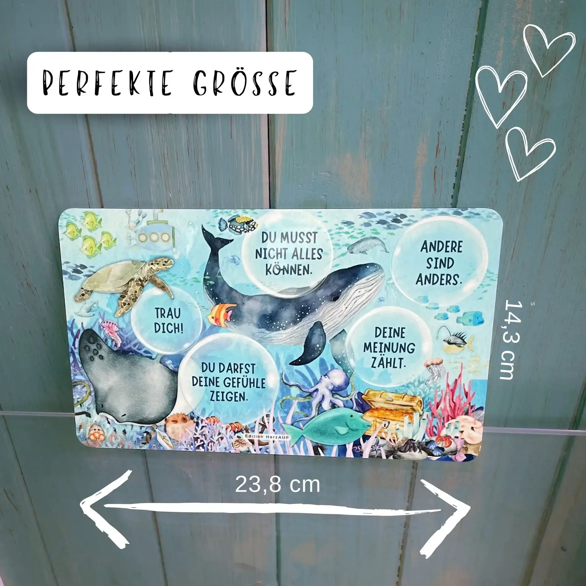 Tauche ein in die magische Unterwasserwelt! Dieses liebevoll gestaltete Frühstücksbrett „Unterwasserwelt“ bringt Freude und Motivation an den Frühstückstisch. Mit fröhlichen Farben und positiven Affirmation in leicht zu lesender Schrift ist es ein wunderbares Geschenk für Kinder zwischen 5 und 9 Jahren, das nicht nur den Alltag verschönert, sondern auch das Selbstvertrauen stärkt. Die verspielten Unterwasser-Motive und die motivierende Affirmation machen jedes Frühstück zum Abenteuer.