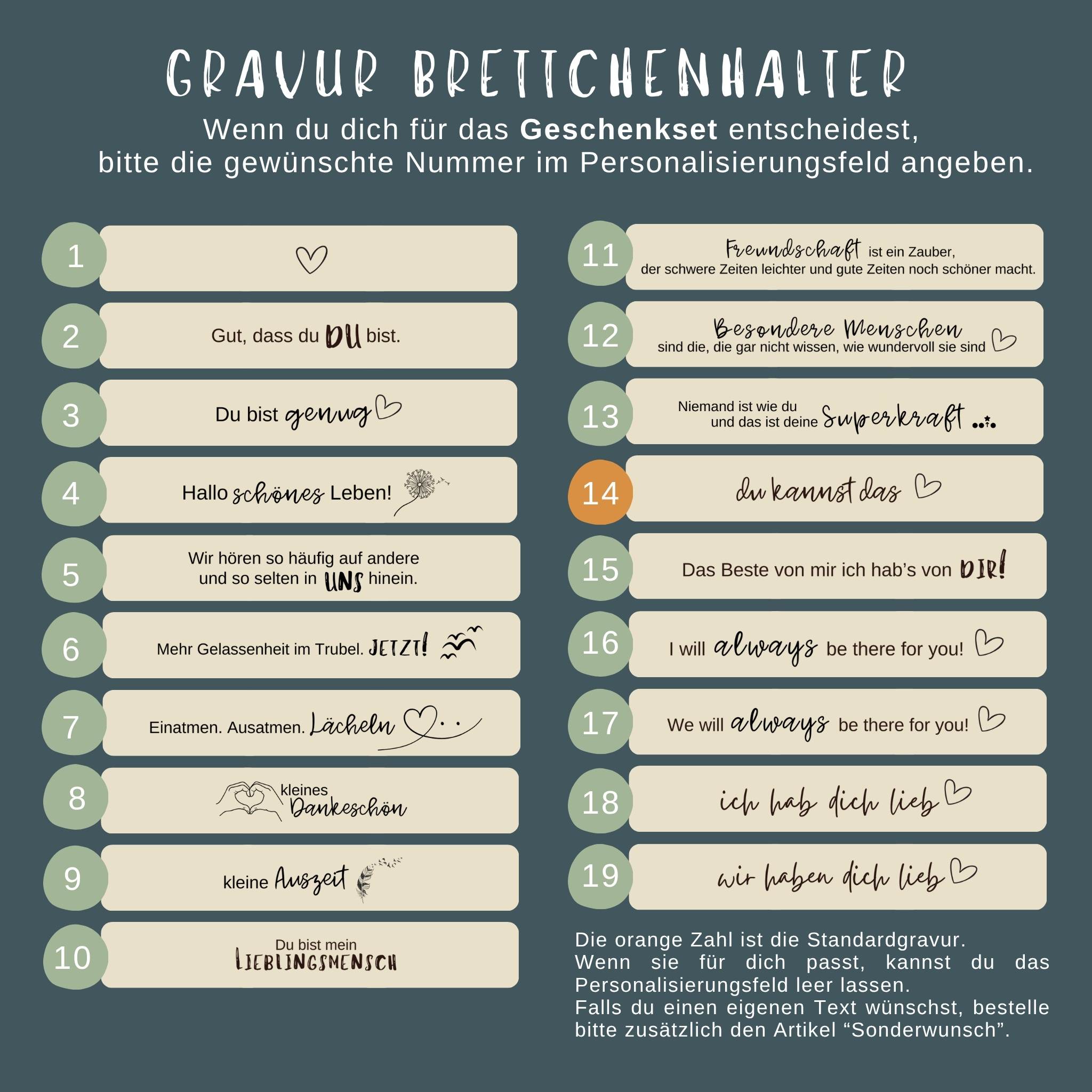 “Richtig tolle Brettchen! Ich habe nicht das erste und bestimmt auch nicht das letzte mal hier gekauft ;) Die Verarbeitung ist toll und ich liebe die positiven und unterstützenden Sprüche.”