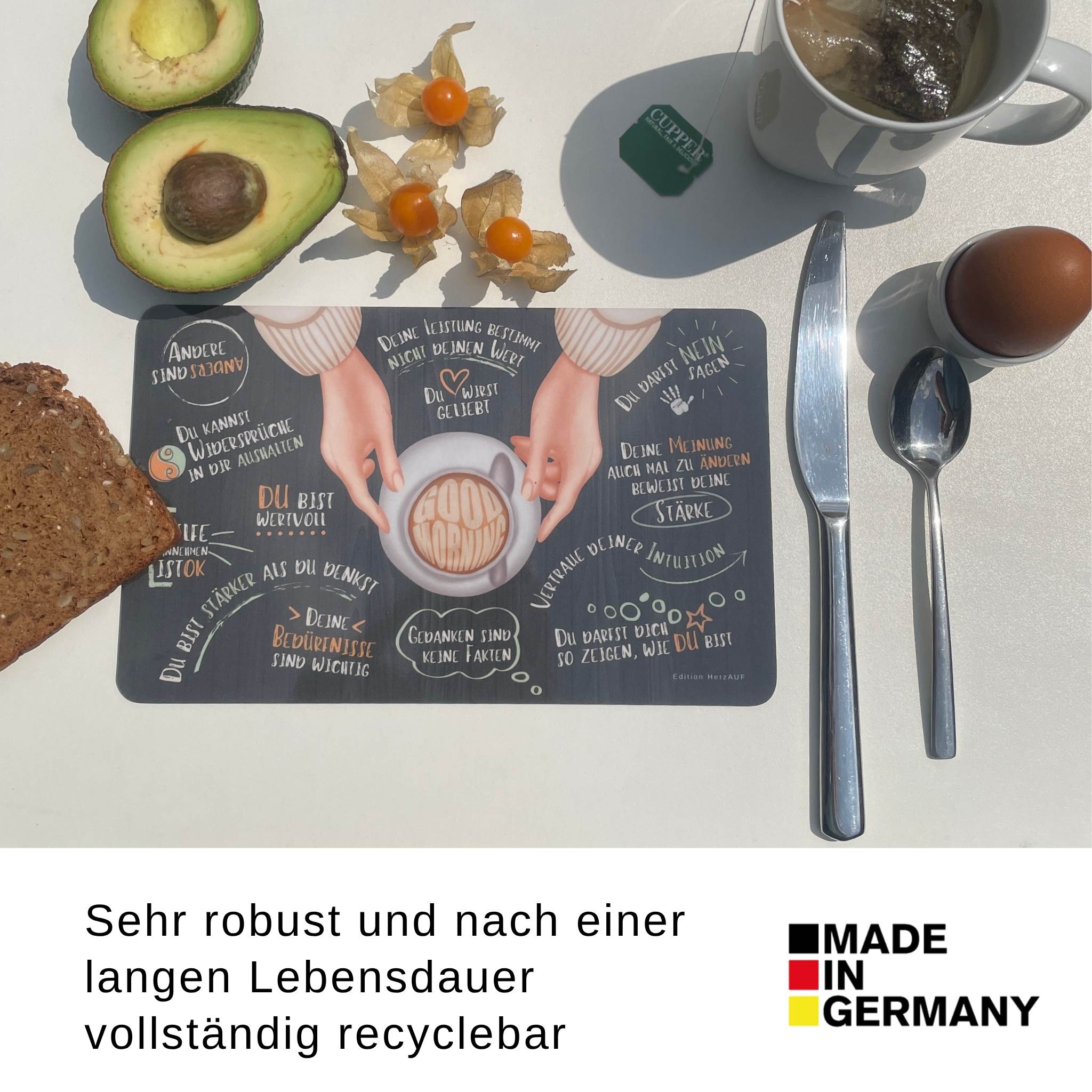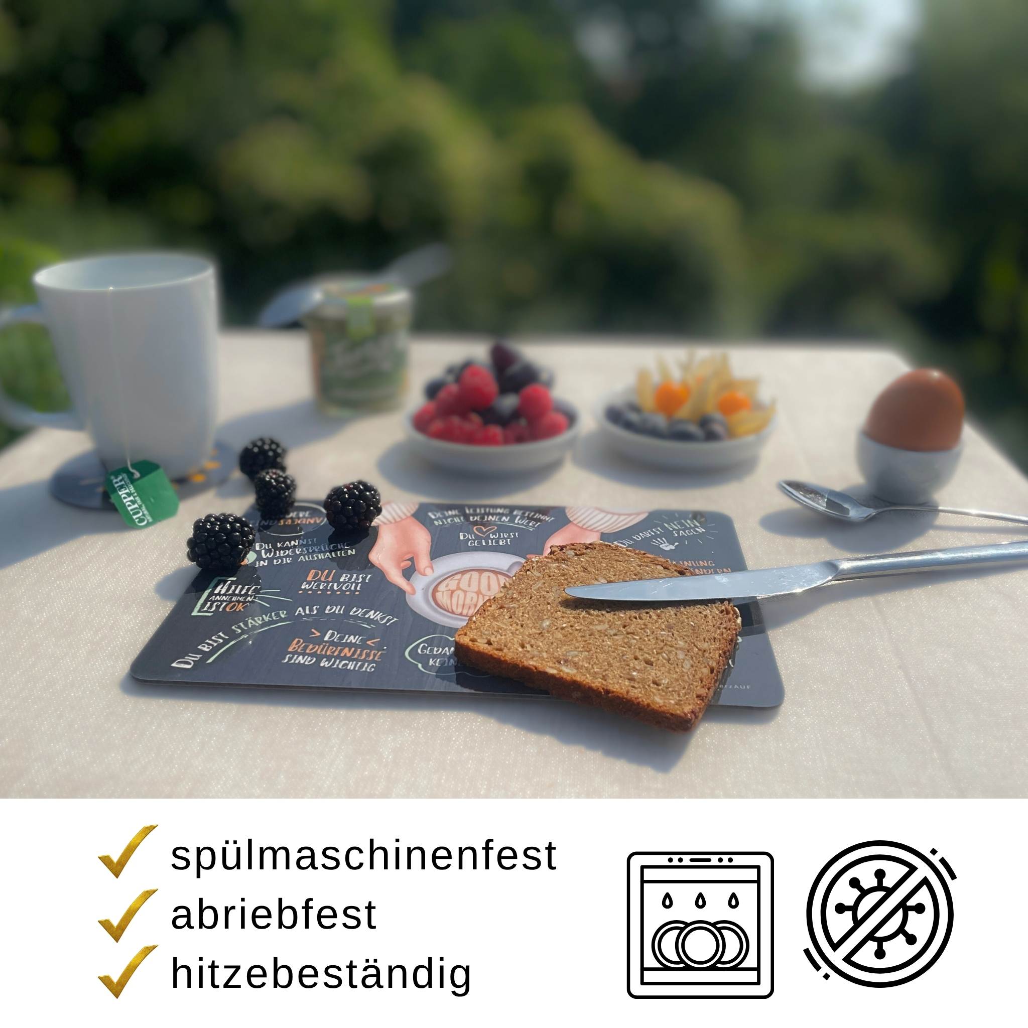 Unsere Frühstücksbrettchen und Getränkeuntersetzer bestehen aus hochwertigem HPL (Hochdrucklaminat) mit einer Schicht Kunstharz. Dadurch sind sie besonders robust, langlebig, lebensmittelecht und hitzebeständig – ideal für den täglichen Gebrauch.