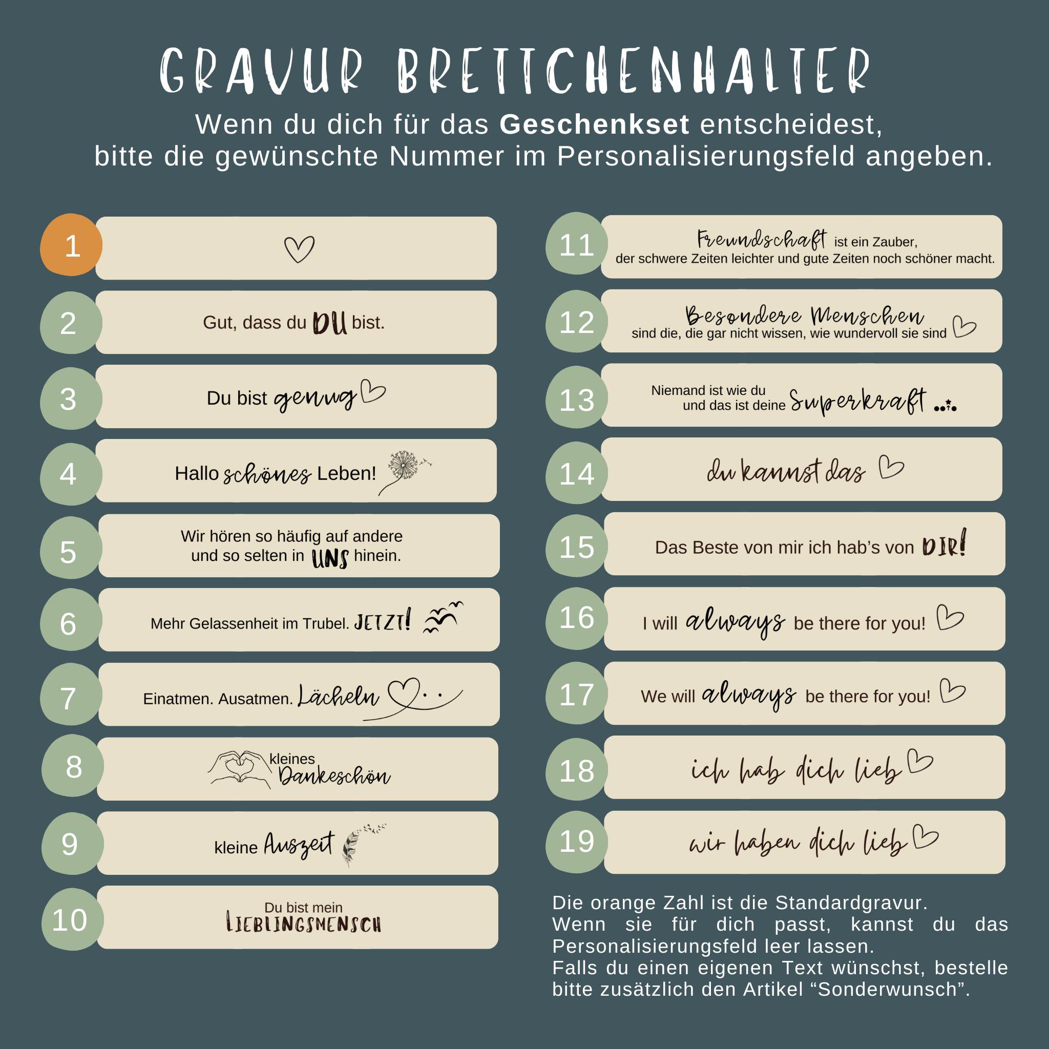 Der Brettchenhalter mit Wunschgravur besteht aus geöltem Buchenholz, wurde mit lebensmittelechtem Leinöl behandelt und per Lasergravur veredelt. Du kannst aus vorgeschlagenen Sprüchen wählen oder eine individuelle Gravur über die Kommentarfunktion angeben – für ein ganz persönliches Geschenk.