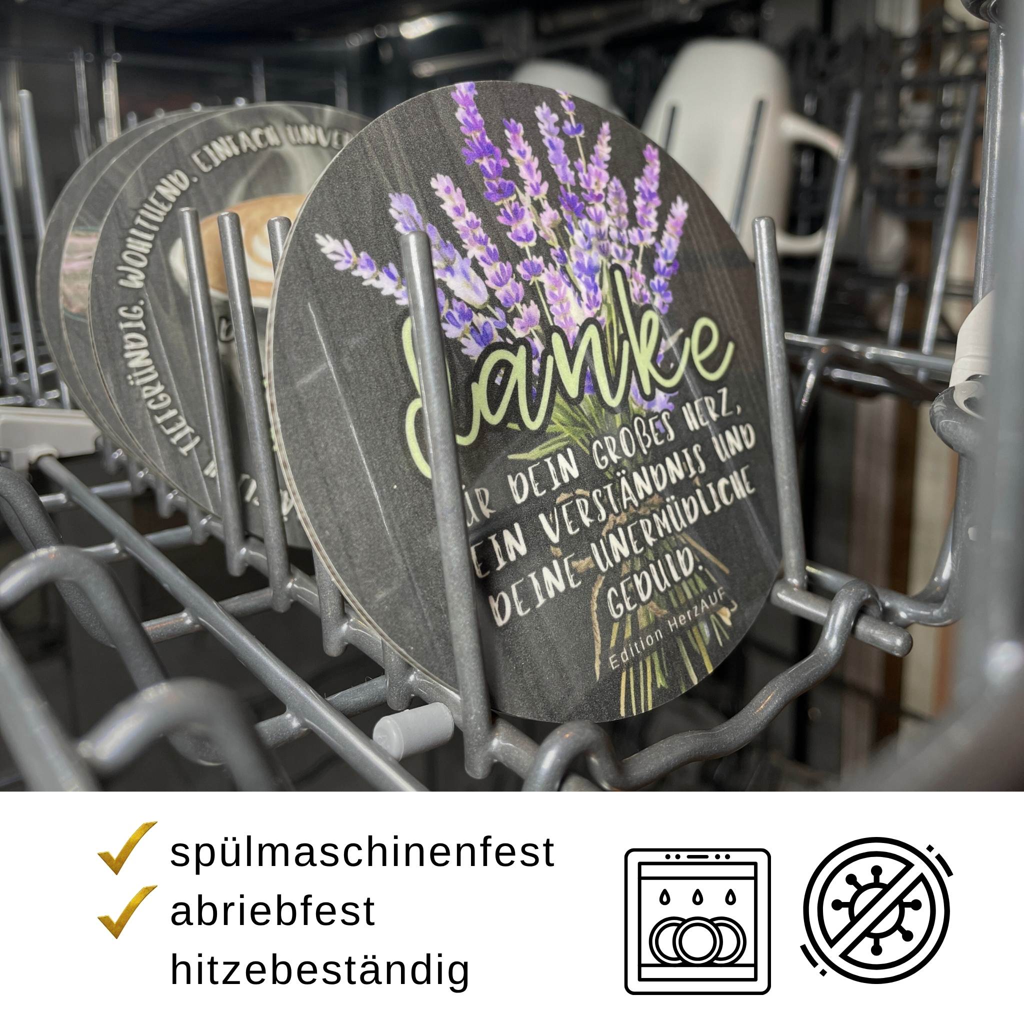 Sowohl Frühstücksbrettchen als auch Getränkeuntersetzer sind spülmaschinengeeignet und dadurch besonders pflegeleicht.