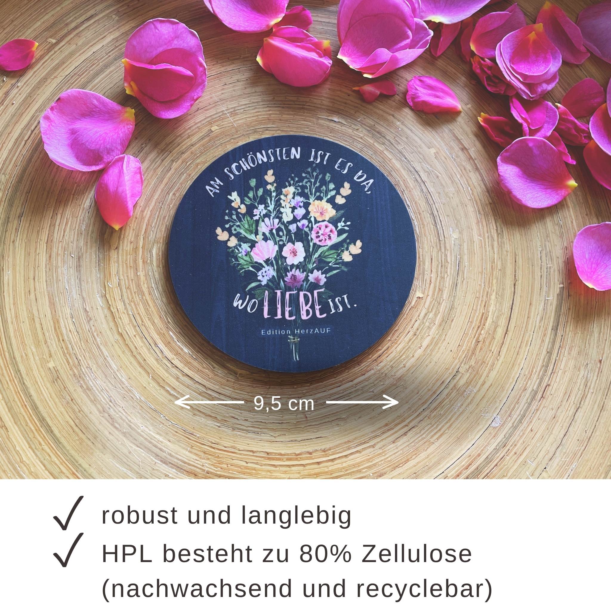 Unsere Frühstücksbrettchen und Getränkeuntersetzer bestehen aus hochwertigem HPL (Hochdrucklaminat) mit einer Schicht Kunstharz. Dadurch sind sie besonders robust, langlebig, lebensmittelecht und hitzebeständig – ideal für den täglichen Gebrauch.