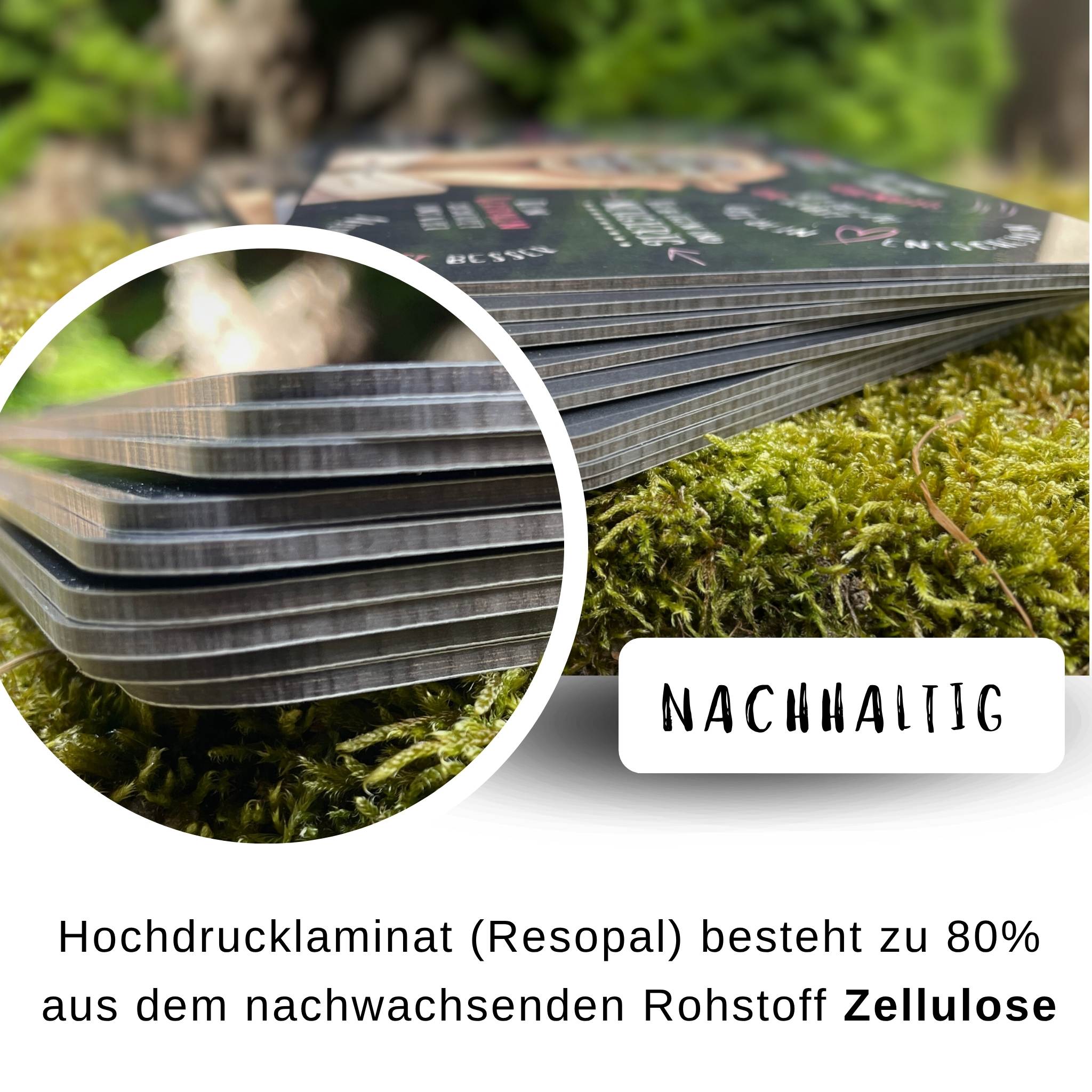 Brettchen und Untersetzer bestehen aus nachhaltigem HPL (Hochdrucklaminat), das nach einer langen Lebensdauer thermisch recycelt werden kann. Der stabile Buchenholzhalter mit Lasergravur ist mit lebensmittelechtem Leinöl behandelt und kann mit deiner individuellen Gravur personalisiert werden.