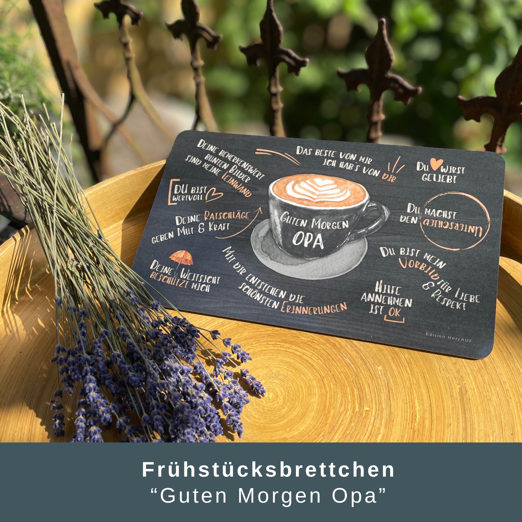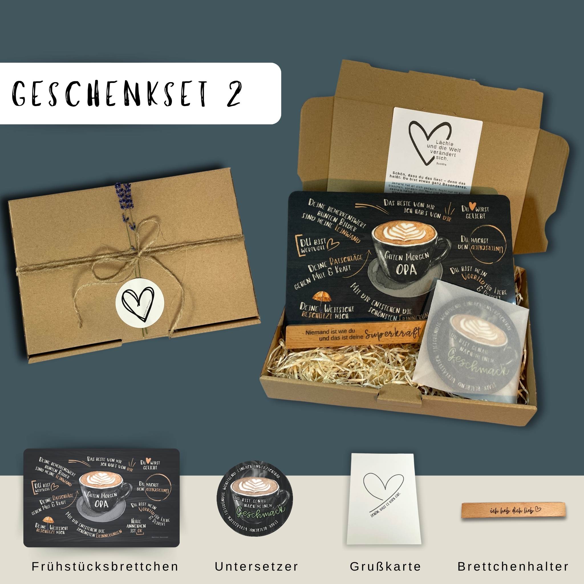 Das Geschenkset für Opa macht jedes Frühstück zu etwas Besonderem. Das Brettchen bietet Platz für Brötchen, Käse oder Obst, während der Untersetzer den Kaffee oder Tee sicher hält. Mit der passenden Gravur wird das Set zum ganz persönlichen Begleiter am Frühstückstisch.