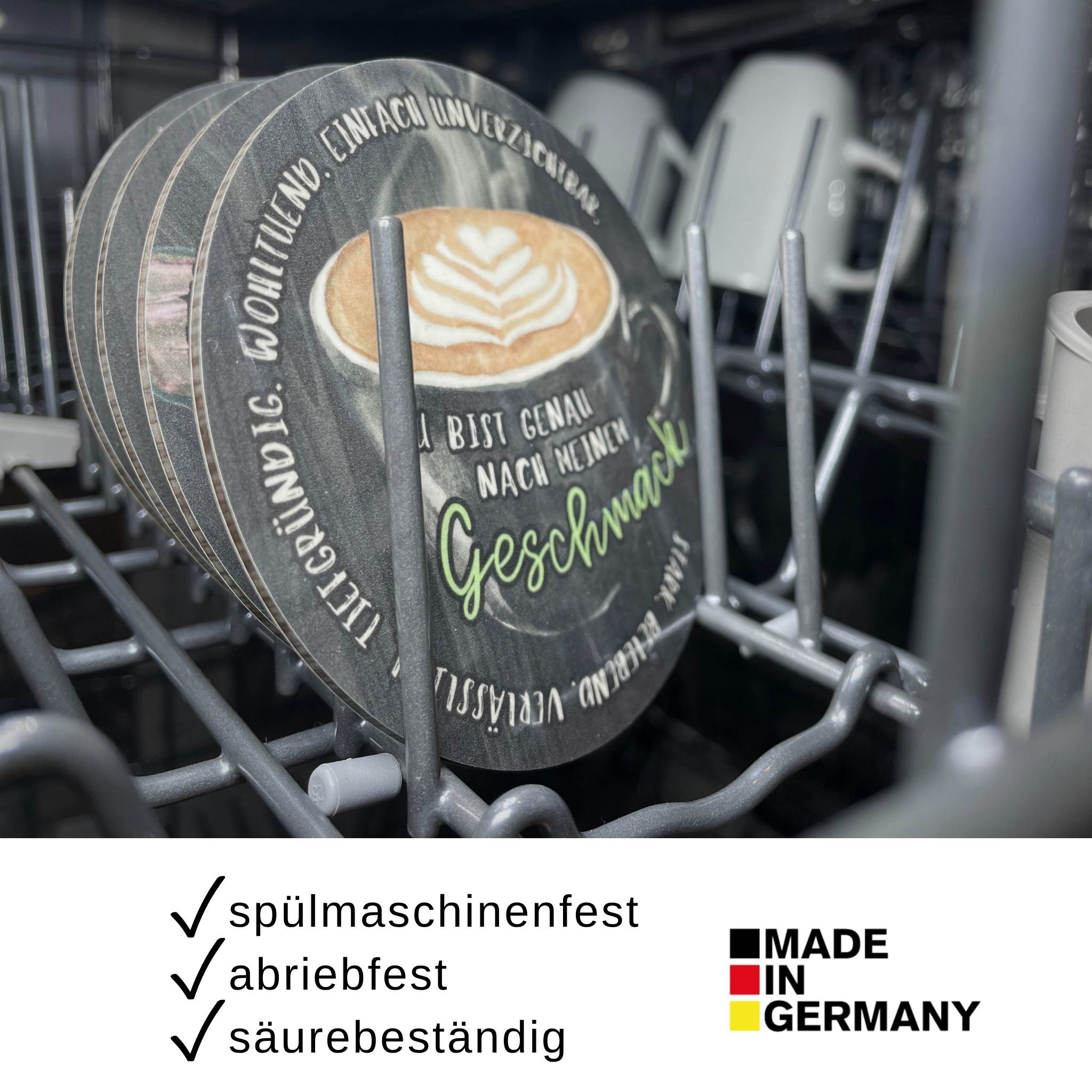 Unsere Frühstücksbrettchen und Getränkeuntersetzer bestehen aus hochwertigem HPL (Hochdrucklaminat) mit einer Schicht Kunstharz. Dadurch sind sie besonders robust, langlebig, lebensmittelecht und hitzebeständig – ideal für den täglichen Gebrauch.