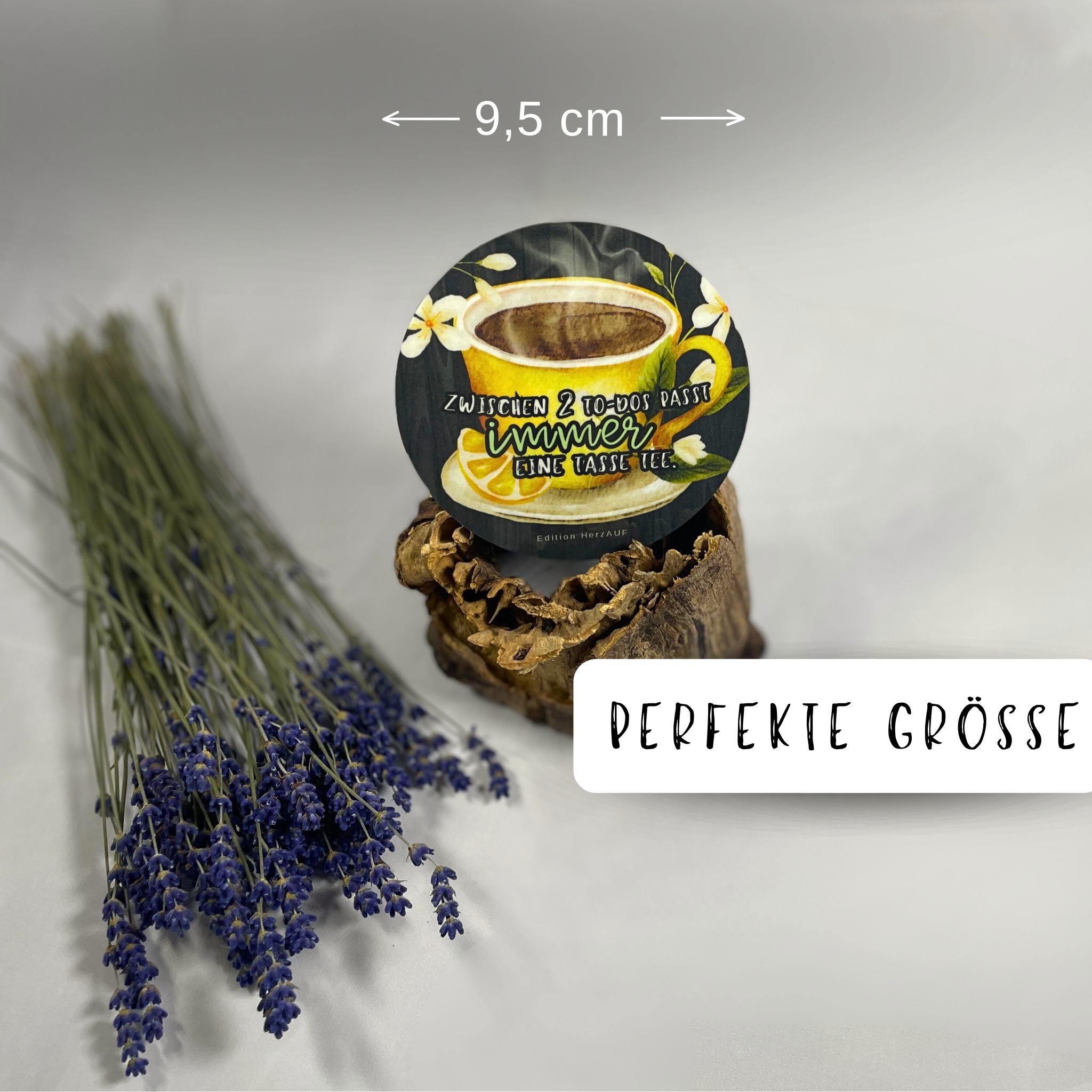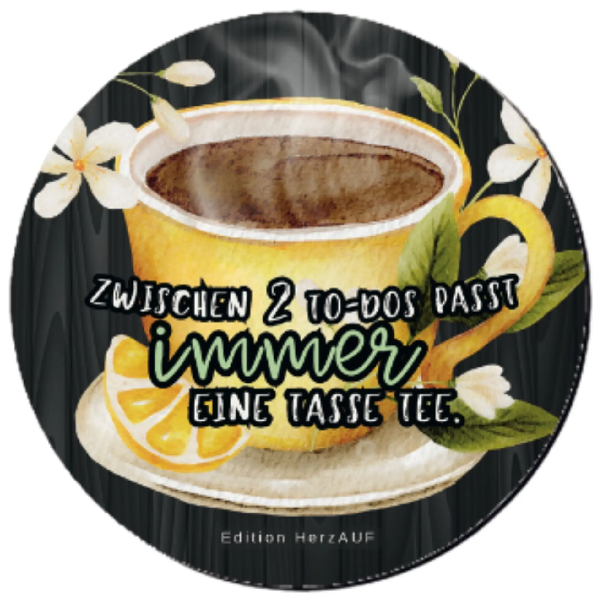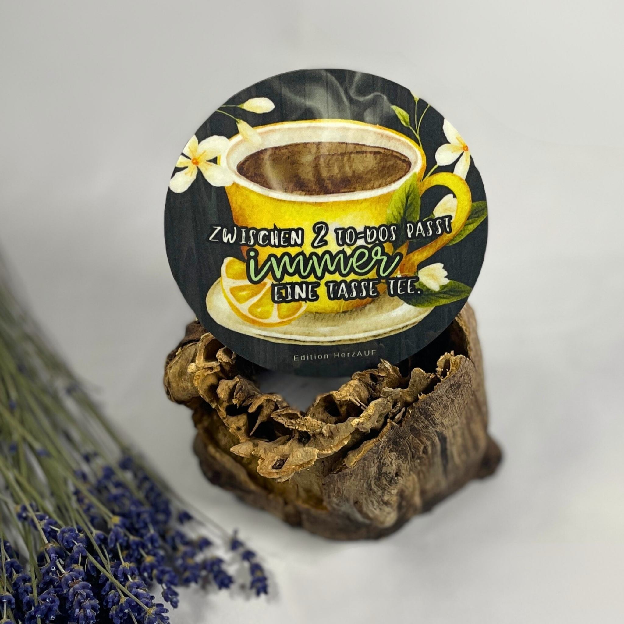 Tee-Untersetzer mit Spruch „Zwischen 2 To-Dos passt immer eine Tasse Tee“ – spülmaschinenfest und perfektes Entschleunigungsgeschenk.