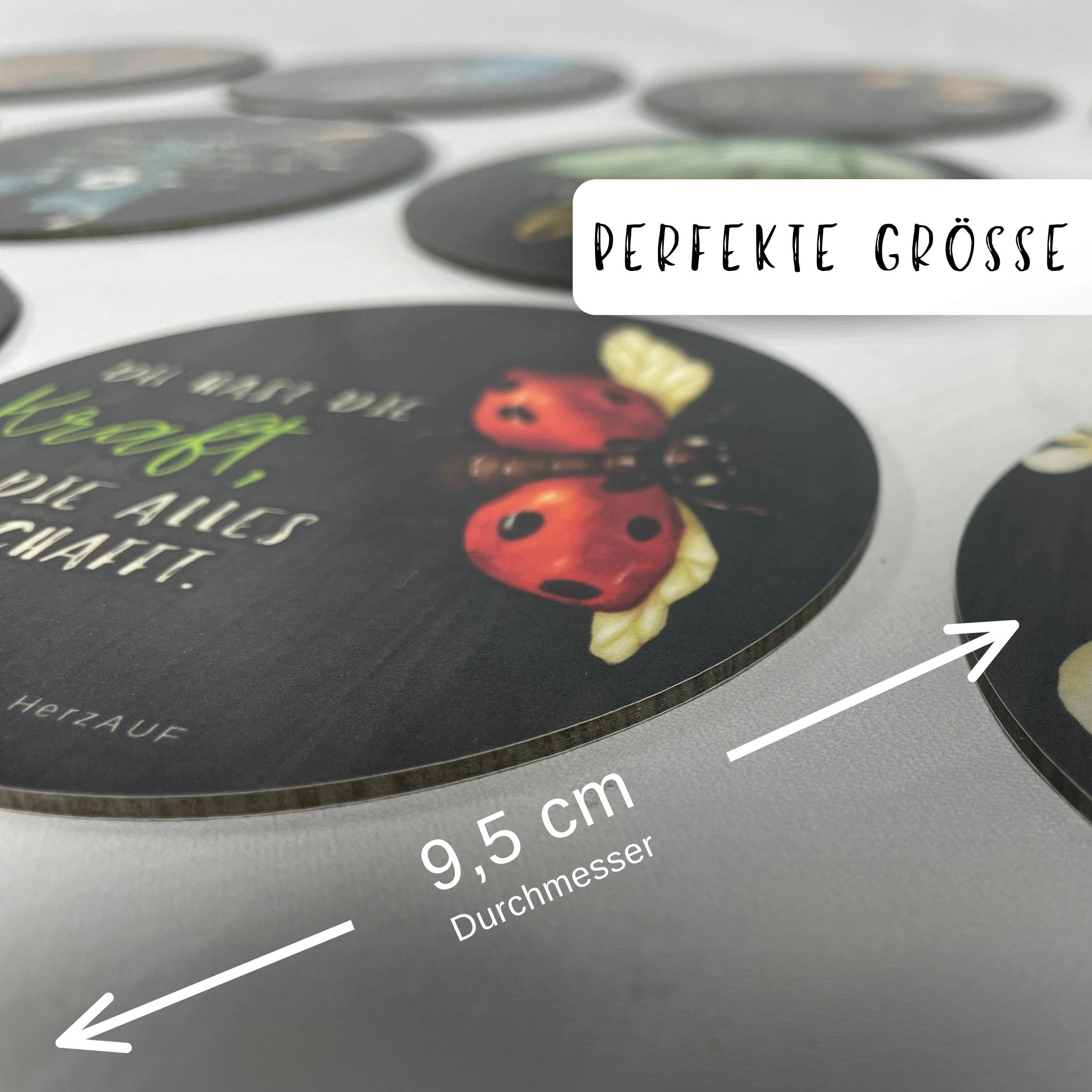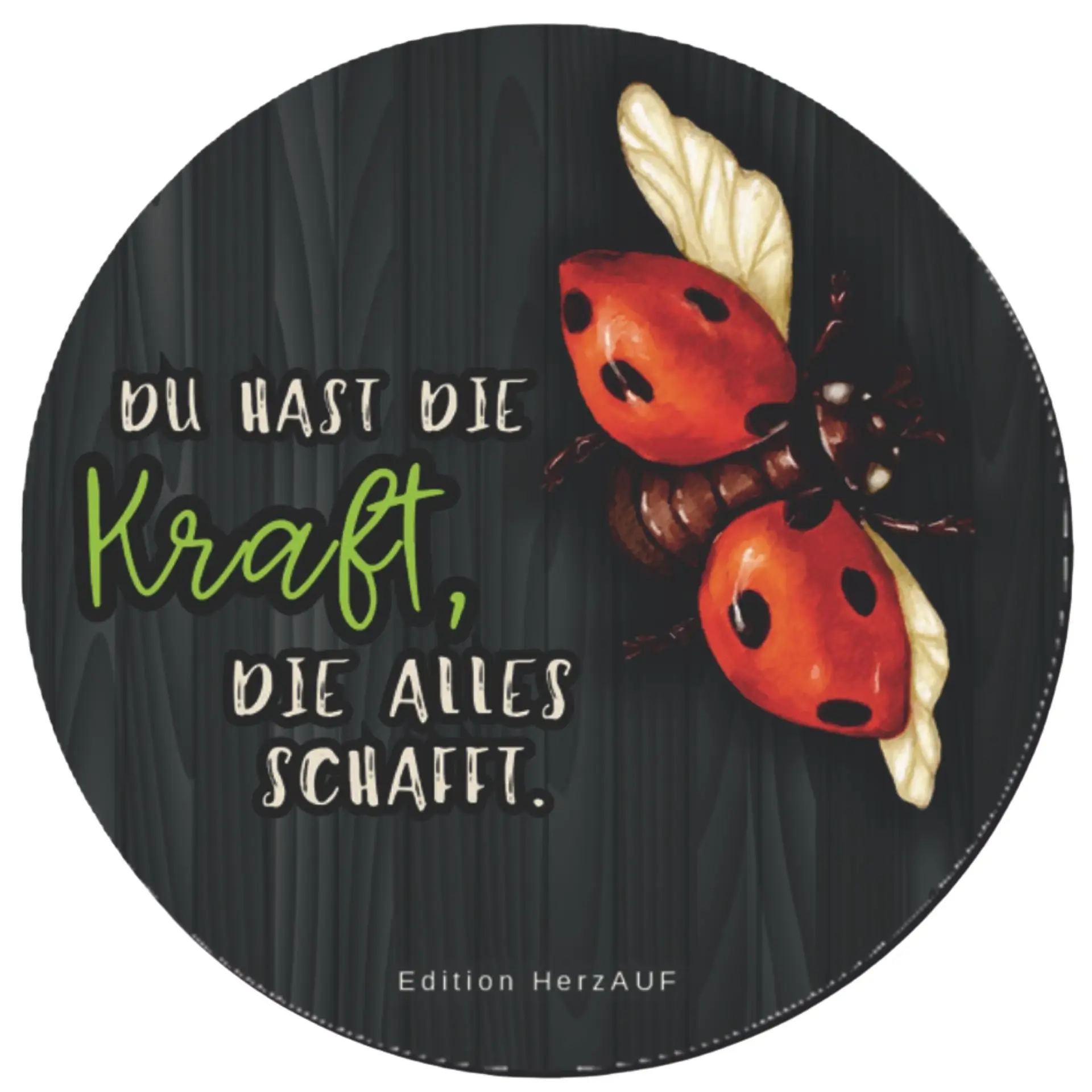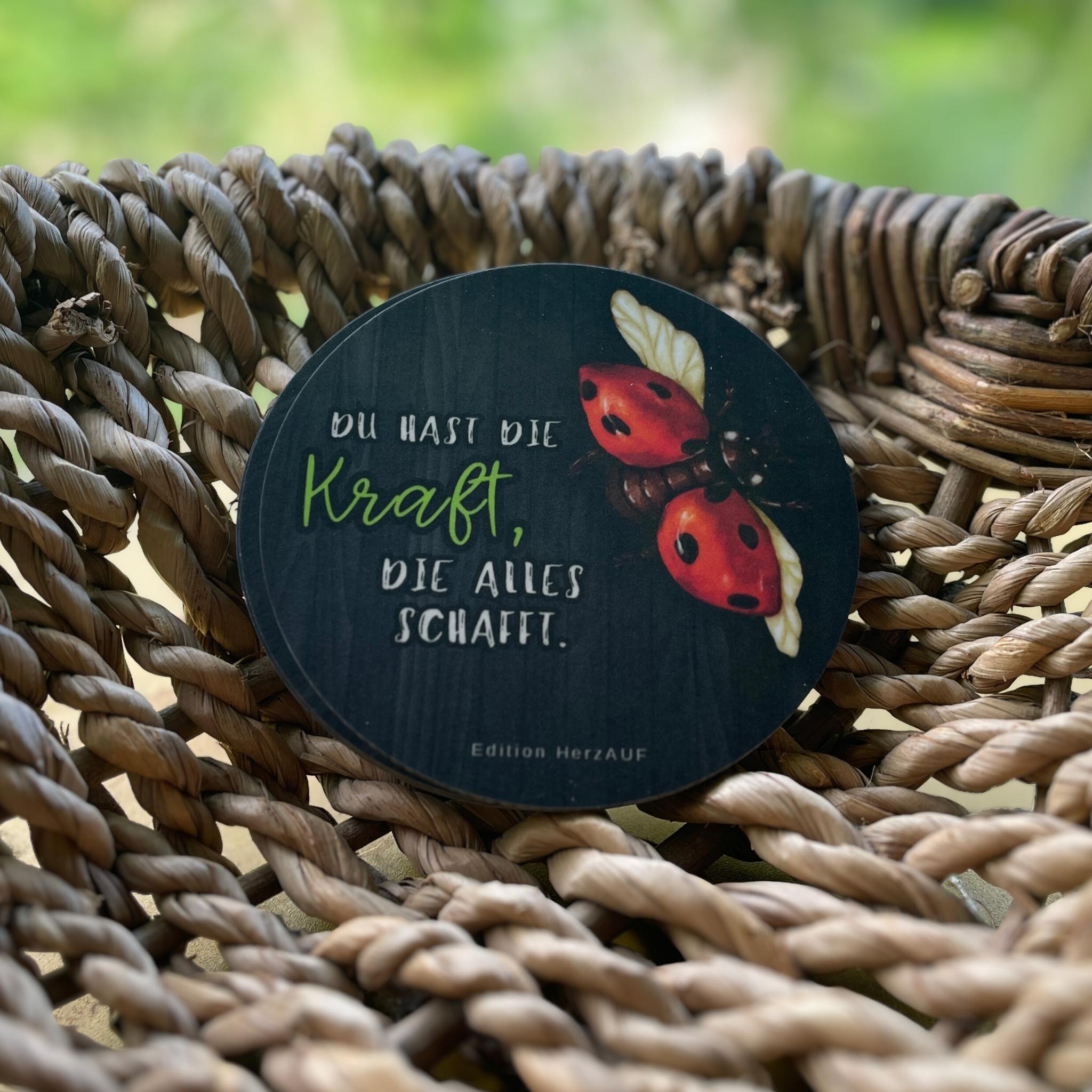 Unser Marienkäfer-Untersetzer trägt die ermutigende Botschaft: „Du hast die Kraft, die alles schafft“