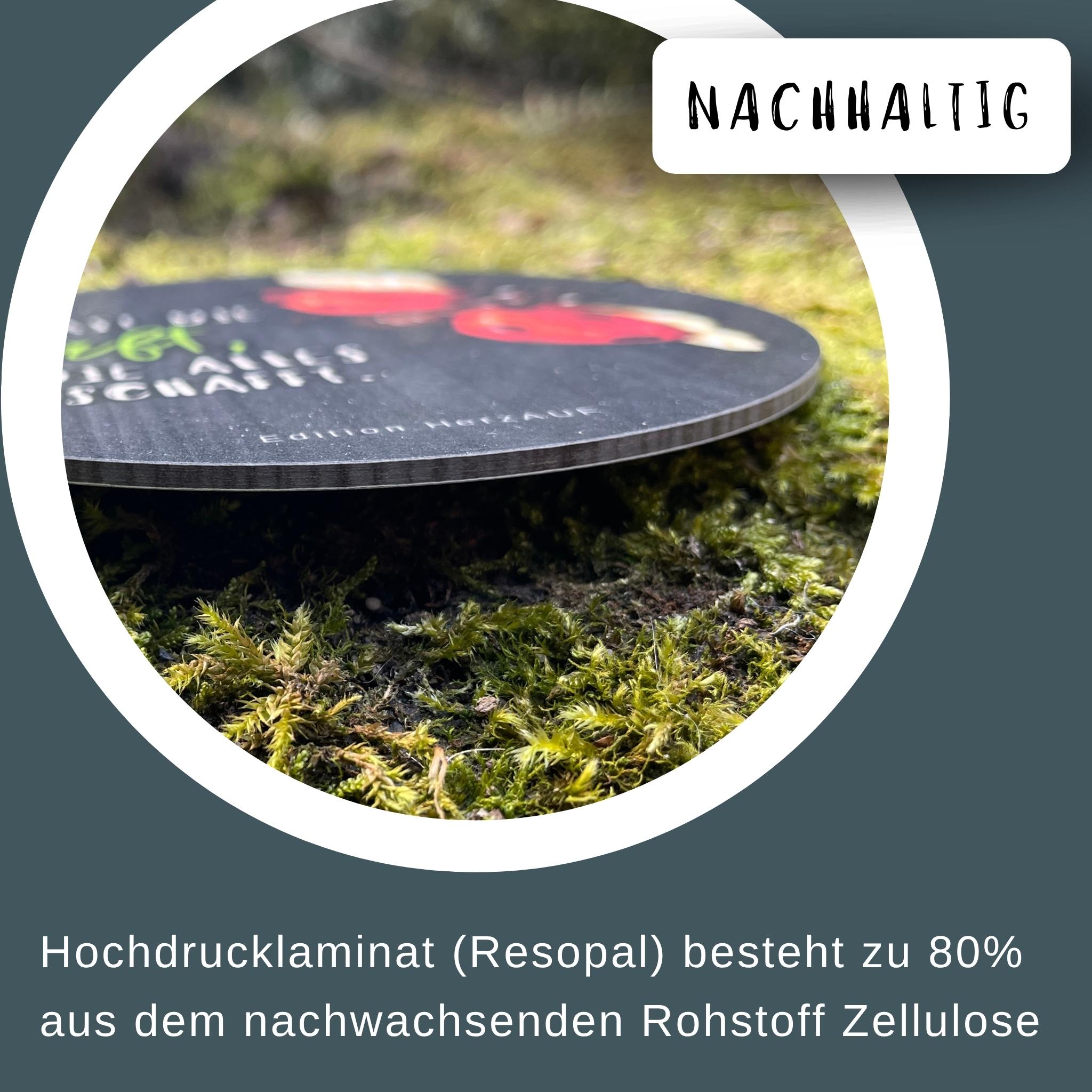 Unsere Frühstücksbrettchen und Getränkeuntersetzer bestehen aus hochwertigem HPL (Hochdrucklaminat) mit einer Schicht Kunstharz. Dadurch sind sie besonders robust, langlebig, lebensmittelecht und hitzebeständig – ideal für den täglichen Gebrauch.