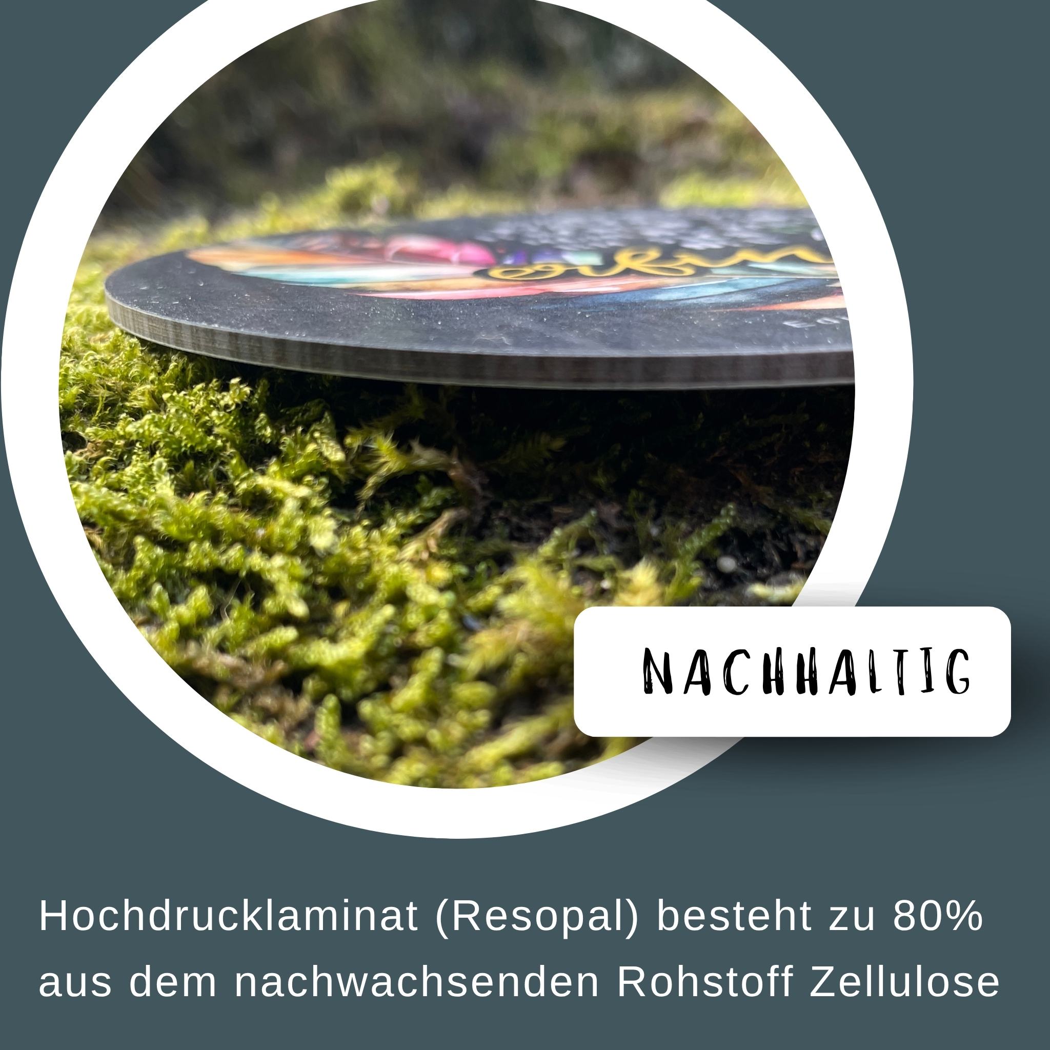 Unsere Frühstücksbrettchen und Getränkeuntersetzer bestehen aus hochwertigem HPL (Hochdrucklaminat) mit einer Schicht Kunstharz. Dadurch sind sie besonders robust, langlebig, lebensmittelecht und hitzebeständig – ideal für den täglichen Gebrauch.